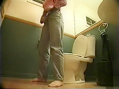 Large glamorous bazookas hide behind a constricted pink top as the golden-haired lowers her jeans and sits on the latrine to pee in a hidden camera movie scene.