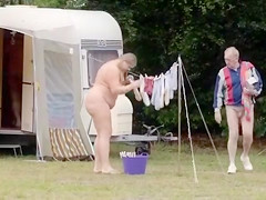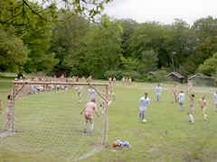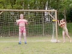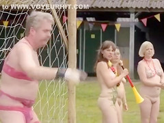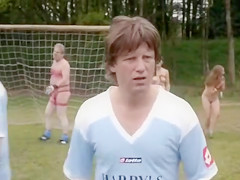 We start in a general store where 2 in nature's garb males buy from a naked gal at the nudist camp. Then we’re on the soccer field where one team is undressed and trying to win the game.