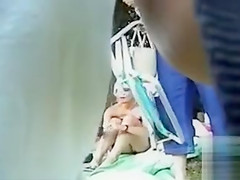 Fleshly lady sits at the beach and enjoys a relaxing time, not knowing that babe is being filmed and her white cotton pants are being nude as this babe sits with the legs close to one one more.