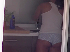 As that babe was cleaning the abode by the open window in constricted shorts and loose reservoir top, this hawt dark brown looker disclosed her large wazoo and her cleavage to my camera.