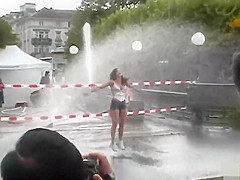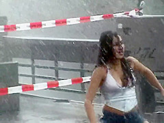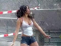 As a part of a music clip, this handsome sex bomb got into the rain with her revealing white reservoir top on and short jeans and proceeded to dance in a carnal manner.