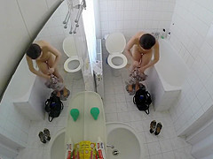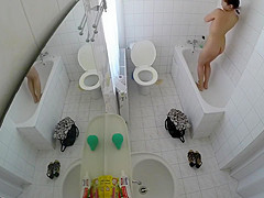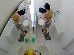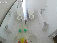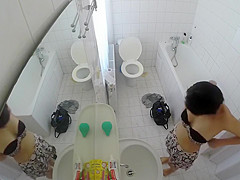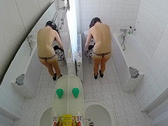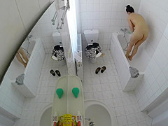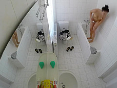 Having totally no idea that there was a livecam in the baths, a raven-haired gal removed her costume and went to the bathtub in order to clean her delights.