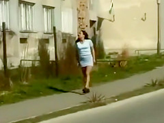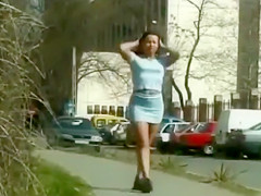 As that babe strolls down the sidewalk it appears to be obvious this hotty in a petticoat and tee shirt is about to do smth wicked. It lastly happens when that babe voids urine all over the sidewalk.