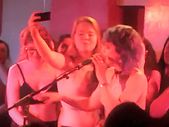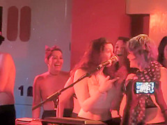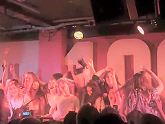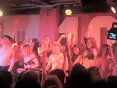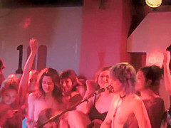 Charming chicks jump on the stage and remove their shirts and bras