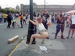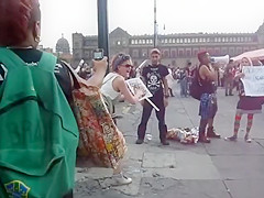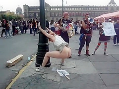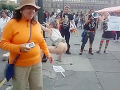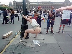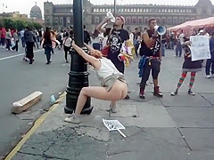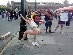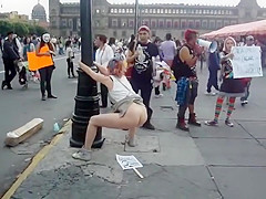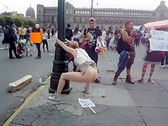 Whilst that babe was protesting, a saucy woman put a poster on the ground, pulled up her petticoat and made her obscene holes spray piddle and inject shit all over it during the time that this babe was holding onto a pole.