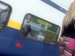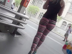 Agreeable golden-haired with large booty walks around in constricted leggings