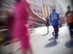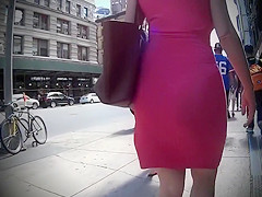 Dark Brown woman was strolling in a taut red suit down the street, so a voyeur took the opportunity to film her large melons, as well as her booty jiggling.