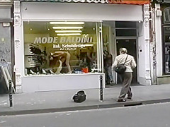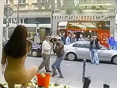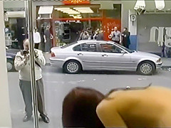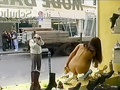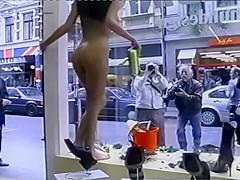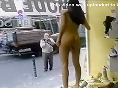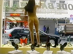 Getting out of her clothing and grabbing a cleaning bucket, a sexual playgirl got to the store window and started washing it with her hairless fur pie and merry boobies out in the open.