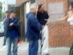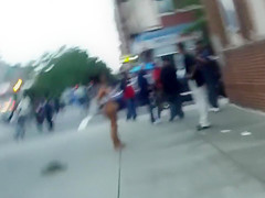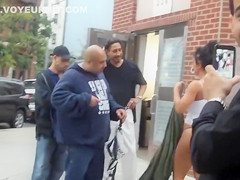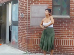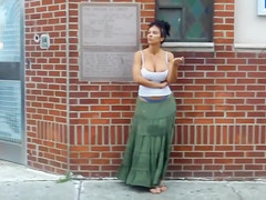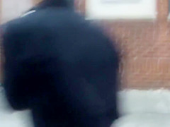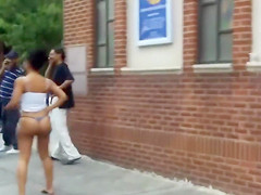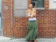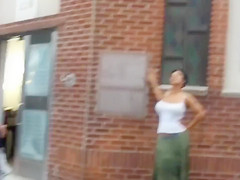 Mad madam with a huge behind stands on the centre of the sidewalk