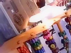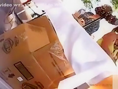 Cleaning up things after a yard sale, a glamorous hottie wearing sunglasses and a relatively short suit got filmed by a peeper and even disclosed underclothes as that babe bent over.