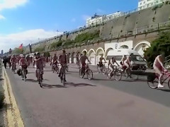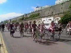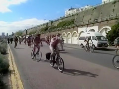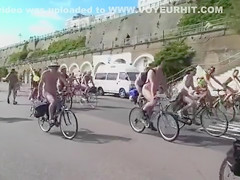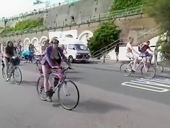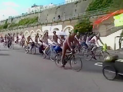 See from the side of the road as the world nude bike ride goes by. Lots of nudists pedal sluggishly, enjoying the sights of the country and the many undressed people around 'em in public.
