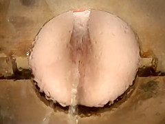 This Babe sits over a crap-house specially made for making pissing videos and voids urine. The pee hits the glass and splashes around and this babe waits until each drop is out.