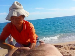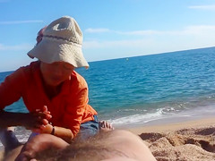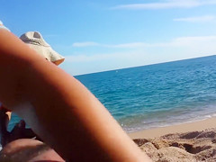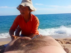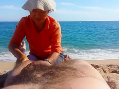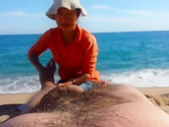 Laying down stripped in the sand at the beach, a sexual man received a full body massage from a luscious older masseuse all the during the time that her daughter was watching.