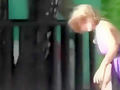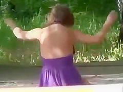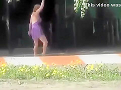 Drunk village babe enjoys doing cartwheels in a short summer suit