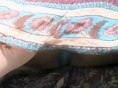 Sleazy woman in a flimsy petticoat unveils her blue pants