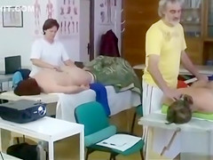During The Time That this demonstration of a touch therapy goes on, there are 3 dudes in the corner ogling a playgirl in pants and very almost touching her wazoo.