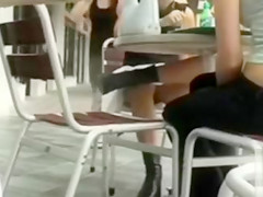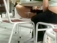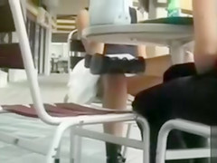 Sitting across from me and enjoying her lunch is a beautiful blond lady with loose legs, as this babe opens 'em wide and brazenly shows her pants during the time that I film up her petticoat.
