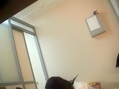 It looks like the work day is over as this lady in a blouse and satin petticoat quickly changes into a pink bikini whilst the well-placed security camera films it all.