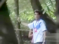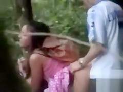 His university girlfriend is bent over and holding the tree for balance as this guy pounds her from behind, thrusting all the way to an big O. Throughout the branches the pervy dude films it all.