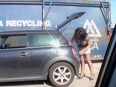 Spruce and curvy is the large mangos brunette hair mother i'd like to fuck in a couple of vintage dark nylons and garter thong. That Babe does a striptease in her car as she’s filmed from the parking lot by her stud.