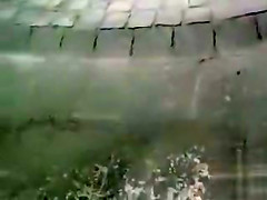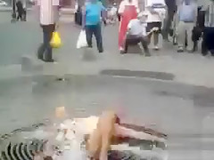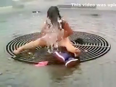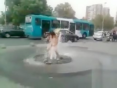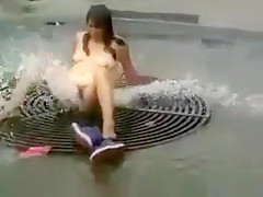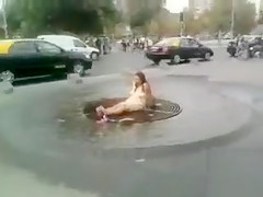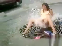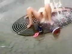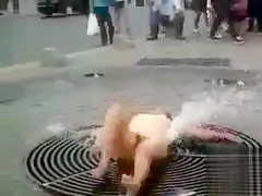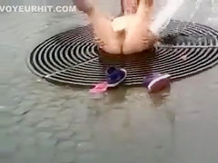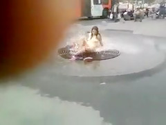 Bare hottie washing her vagina on the street