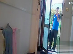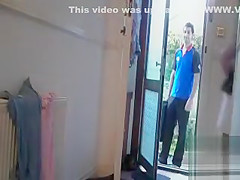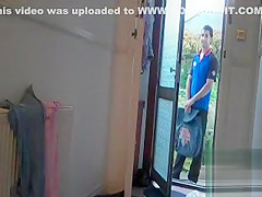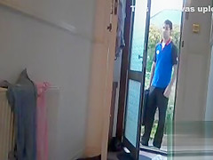 Sexually Excited wife puts a camera to film her when delivery courier arrives. Fortunate man didn't await that her towel would fell off and saw her stripped.