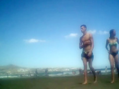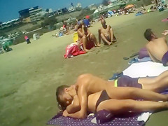 It’s a warm day at the beach and there are many babes to check out. The breasty beauty on her towel looks great and the blond fooling around with her boyfriend is stacked also.