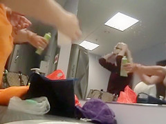 Some cleaning woman brought a camera to the dressing area to record her nude allies in front of the mirror after they just got out of the shower.