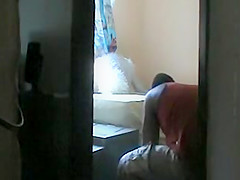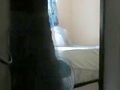 During The Time That he’s busy fixing the fan this babe jumps into ottoman and widens her legs to show her vagina. When this chab pulls out his jock and jerks off this babe pretends not to notice.