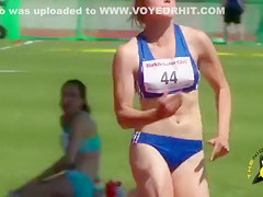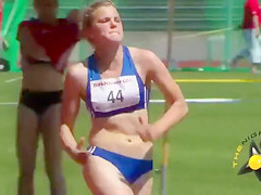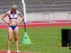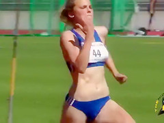 Track and field babes always look great and this blond is no exception in her skimpy blue outfit. The spandex bottoms cling to her gazoo wonderfully whilst this babe runs.