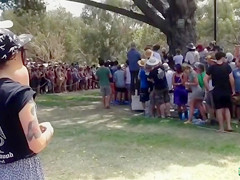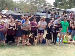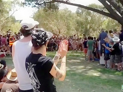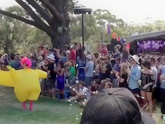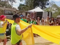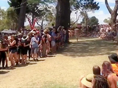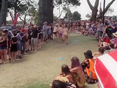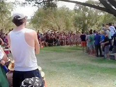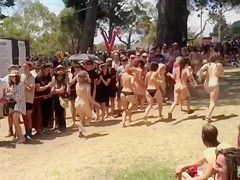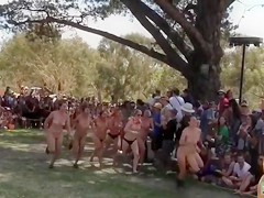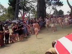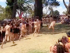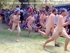 Hundreds of spectators have gathered to see dozens of participants run in the stripped race. Slow motion episode shows the exposed and topless lads and beauties sprint as fast as they can.