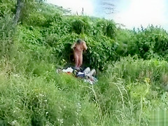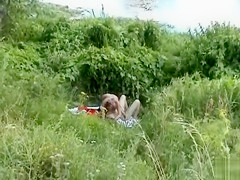 Hidden in the tall grass and behind a large bush, this pair enjoys a quick session of lovemaking that finishes with a spunk flow on her billibongs. They didn’t know a voyeur was filming.
