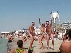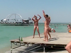 Topless sweetheart dancing with undressed boys in public
