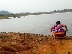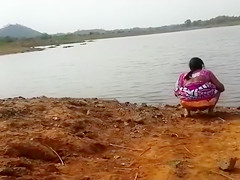 This Babe walks right up to the lake, pulls up her sarong and squats to take a make water in the mud. Her gazoo is brown and hot, and the pee looks pleasing flowing onto the ground.