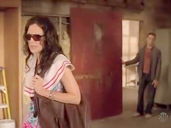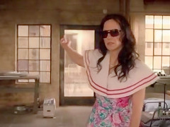 Description: In this scene from Weeds Mary Louise Parker visits her brother and sits on his crapper to take a make water. That Babe pulls her pants down to her knees to empty her bladder and it looks great.