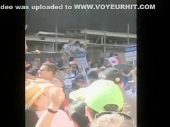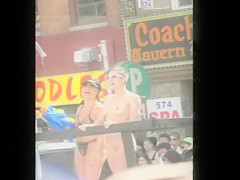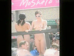 Public nudity clearly arouses this non-professional exhibitionist as that babe rides down the street on a parade float and shows off for everybody. Her merry mambos with pierced nipps are super hawt.