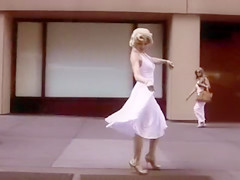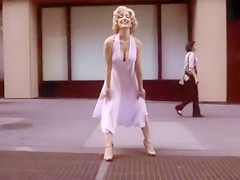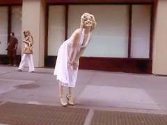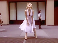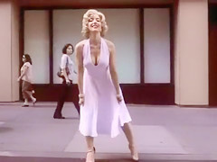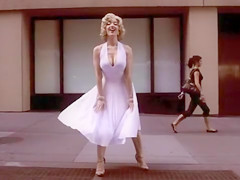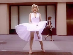 Reenacting the noted Marilyn Monroe upskirt scene is this nice-looking lady in a white costume, golden-haired wig and red lipstick, and she’s doing it in public as people walk by.