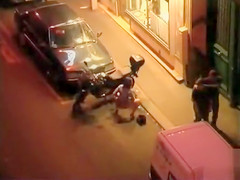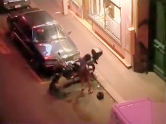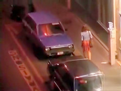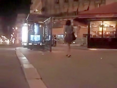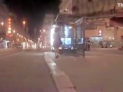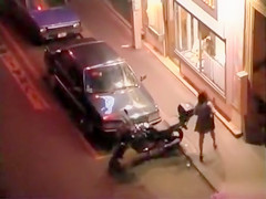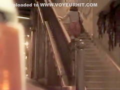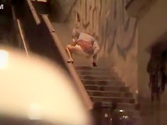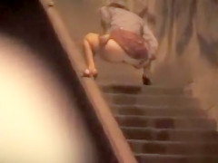 That Babe 1st urinates behind a motorcycle but doesn’t quite finish 'coz people come along. Her second stop is at the top of the stairs and this babe empties her bladder there.