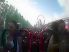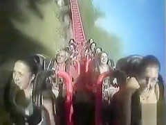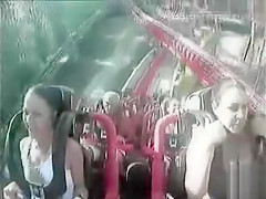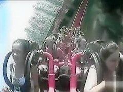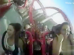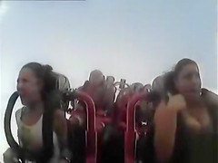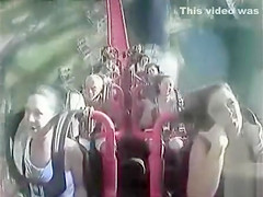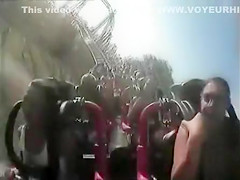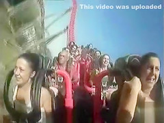At the front of the rollercoaster a camera pointed at the passengers shows her large natural zeppelins coming out of her top. That Babe tries to cover up and giggles from the thrill.