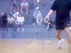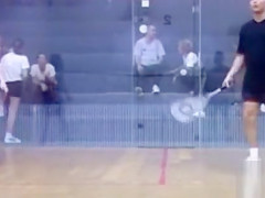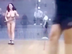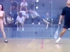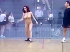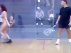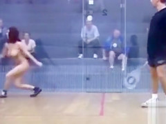 It is a real mystery why is there such a little audience watching this hawt squash game. The exposed lady playing has a flawless body and 2 monster wobblers to go with it.