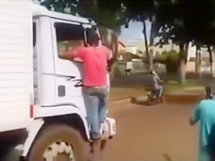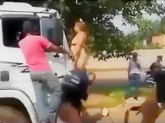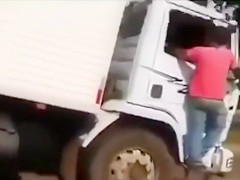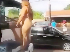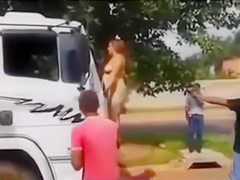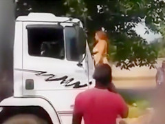 It looks like the stripped mamma with a plump abdomen and large wobblers is protesting in some way as this babe stands on the bumper of the truck and tries to prevent the stud from driving.