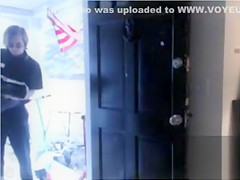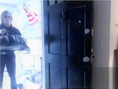 Sheer red underware and haunch high leather boots are her outfit of choice for taking the pizza delivery. This Babe happily shows off her a-hole to the chap likewise and that guy has to stare.