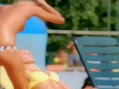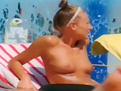 Her lithe body is oiled up and her miniature pointer sisters look seductive as they soak up the sun on a day at the water park. She’s the solely one with her mangos bare.