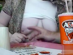 Obese lady pulls out her wobblers in the restaurant