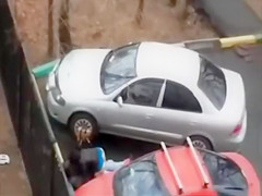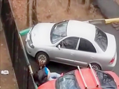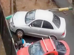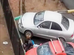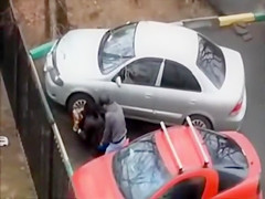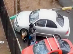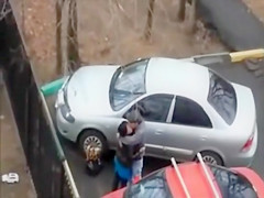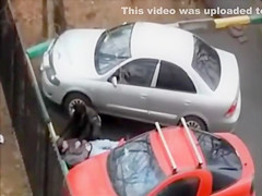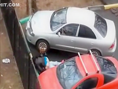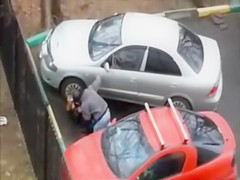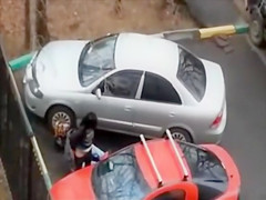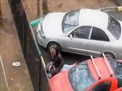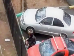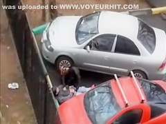 It’s the midst of the day as a peeper films from above but the pair doesn’t care as they fool around, wank, kiss, and even have a little sex betwixt cars in a parking lot.