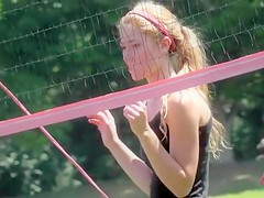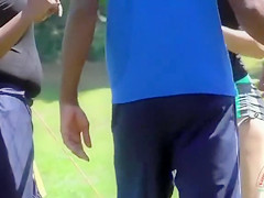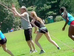 Of all the allies playing volleyball, this cute dark brown has the hottest body and this babe wears petite shorts that cling to her marvelous a-hole so the voyeur perv can have a fun 'em.