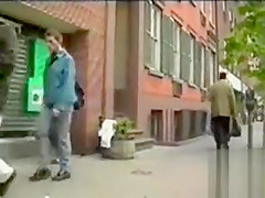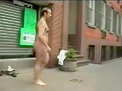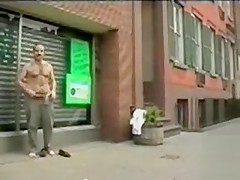 Bushy nude stud masturbates on a town sidewalk