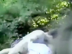 Hidden behind a tree, the perv has a great view of this pair in the public place as they fool around on a blanket. His lusty fingering of her slit is the hottest part!