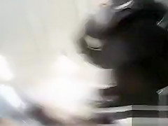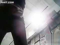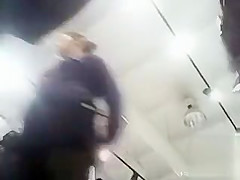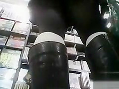 This Babe wears a leather jacket, boots, a short petticoat and darksome hose, and a camera on the floor of the electronics store looks up her petticoat to admire her wazoo and pants.