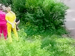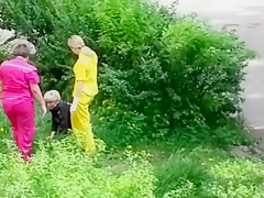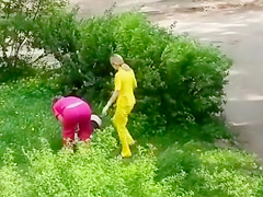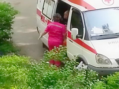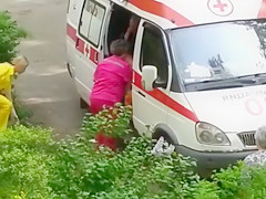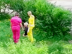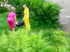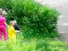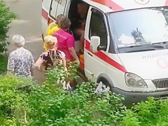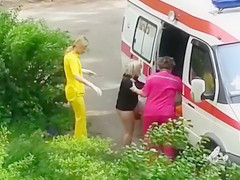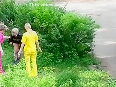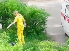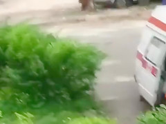 Description: Anybody called an ambulance cuz they saw this Russian woman passed out in the grass. We see the movie from an apartment as they wake her up and watch that that babe has no panties on.